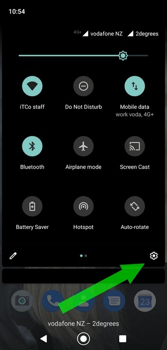 1. Open your phone's settings, either by opening the 'Settings' app or swiping down on the navigation bar and tapping the settings cog. (click for image)