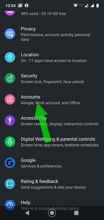 2. Select the ‘Accounts’ option. This can sometimes be called ‘Cloud and Accounts’ or ‘Backup and Accounts’, so long as it has that ‘Accounts’ keyword. (click for image)