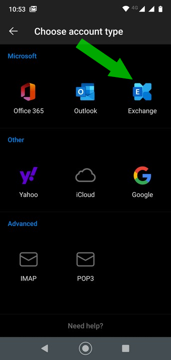 3. Select the 'Exchange' account type. (click for image)