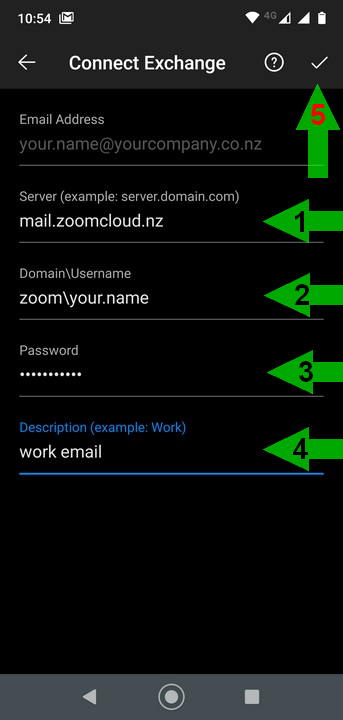 4. Enter the following information:Server: mail.zoomcloud.nzDomain\Username: enter "zoom\" followed by the first part of your username. eg: if your username is john.doe@company.co.nz, enter only "john.doe"Password: your passwordDescription: optional. eg: work emailThen tap the tick to continue (click for image)